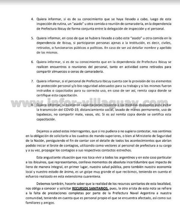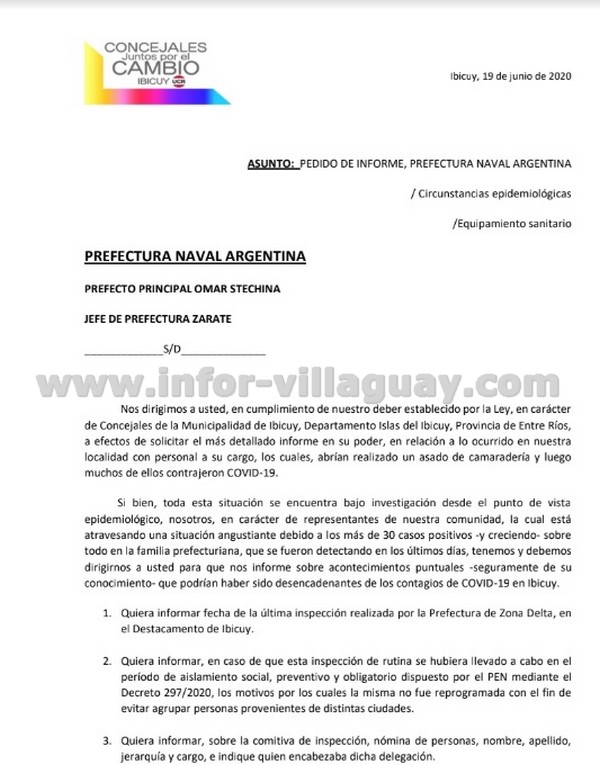 Los ediles de Juntos por el Cambio de Ibicuy enviaron una nota a autoridades de Prefectura en la que preguntan si se realizó “un asado o una comida” en el destacamento Ibicuy luego de la inspección de rutina habitual.La nota está dirigida puntualmente al Prefecto Principal Omar Stechina, Jefe de Prefectura Zárate, a quien piden información “en relación a lo ocurrido en nuestra localidad con personal a su cargo, que habría realizado un asado de camaradería y luego muchos de ellos contrajeron COVID-19”.“Si bien, toda esta situación se encuentra bajo investigación desde el punto de vista epidemiológico, nosotros, en carácter de representantes de nuestra comunidad -que está atravesando una situación angustiante debido a los más de 30 casos positivos que se registraron sobre todo en la familia prefecturiana- tenemos y debemos dirigirnos a usted para que nos informe sobre acontecimientos puntuales -seguramente de su conocimiento- que podrían haber sido desencadenantes de los contagios de COVID-19 en Ibicuy”.Entre las cuestiones puntuales, solicitan un “informe sobre la comitiva de inspección, nómina de personas, nombre, apellido, jerarquía y cargo, e indique quien encabezaba dicha delegación” y que “en caso de que se hubiera llevado a cabo este ‘asado’ u otra comida en la dependencia de Ibicuy, si participaron personas ajenas a la Institución, es decir, civiles, retirados, o funcionarios públicos o políticos. En caso de ser así detallar nombre y apellido de los mismos”.“Dejamos a usted estos interrogantes, que si no pudiera o no supiera contestar, nos sentimos en la obligación de solicitarlo a los cuadros de mando superiores, o bien al Ministerio de Seguridad de la Nación, persiguiendo el fin de contar con el detalle de todos los acontecimientos que habrían podido iniciar el brote de contagios, utilizando como vectores al personal de prefectura a su cargo y a su vez, propagar los contagios a sus respectivos contactos estrechos”, sostuvieron los ediles de Juntos por el Cambio.“Esta angustiante situación que nos toca vivir a todos los argentinos y en este caso particular a los ibicuinos conlleva momentos de absoluta incertidumbre que impacta de lleno de manera integral, en primer lugar, nuestra salud pública, pero también en nuestra economía local y nuestro estado de ánimo. Es un golpe muy grande el que recibimos, teniendo en cuenta el esfuerzo realizado en esta extensísima cuarentena”, manifestaron los concejales Silvina Schiavo, Alejandra Taborda y Ezequiel Maneiro.“Es absolutamente incomprensible y por tanto inadmisible que una fuerza de seguridad federal que cuenta con más 20.000 hombres y mujeres, como así también con recursos humanos profesionales de la salud, médicos, enfermeras, psicólogos y demás personal adecuado para brindar asistencia en esta crisis, como así también, equipamiento sanitario, ambulancias, una carpa u hospital de campaña, hoy no estén presentes en Ibicuy colaborando con nuestra comunidad afectada por un brote que habría surgido -todos los indicios así lo señalan- desde su institución local”, reprocharon. (APFDigital)