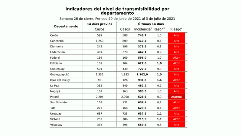 Respecto a los indicares epidemiológicos a nivel geográfico en relación al número de casos diagnosticados en los últimos 14 días y la comparación con los últimos 14 días previos, Garcilazo dio cuenta que “el descenso de casos ha sido muy poco en relación a las semanas anteriores, e incluso algunos departamentos aumentaron el número de casos, como Victoria, Uruguay, Islas, Gualeguaychú y Feliciano”.