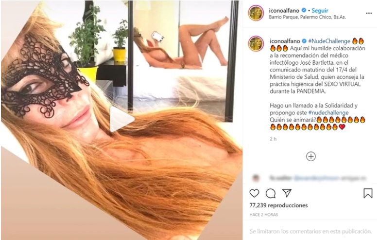 “Aquí mi humilde colaboración a la recomendación del médico infectólogo José Bartletta, en el comunicado matutino del 17/4 del Ministerio de Salud, quien aconseja la práctica higiénica del SEXO VIRTUAL durante la PANDEMIA. Hago un llamado a la Solidaridad y propongo este #nudechallenge. ¿Quién se animará?”, escribió Alfano.