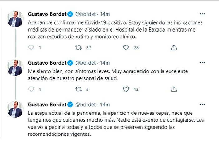 “Acaban de confirmarme COVID-19 positivo. Estoy siguiendo las indicaciones médicas de permanecer aislado en el Hospital de la Baxada mientras me realizan estudios de rutina y monitoreo clínico”, expresó el mandatario provincial a través de su cuenta en la red social Twitter, y aclaró que se encuentra en buenos estado de saludo, con síntomas “muy leves”.