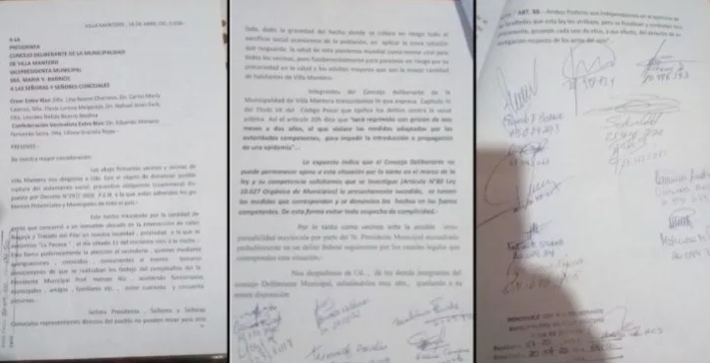 Mediante una nota firmada por una gran cantidad de vecinos, pusieron en conocimiento a la presidenta del Concejo Deliberante, María Barrios, y a todos sus integrantes, de la grave falta cometida por el intendente, tipificada incluso en el Código Penal, y exigieron que se tomen medidas al respecto.