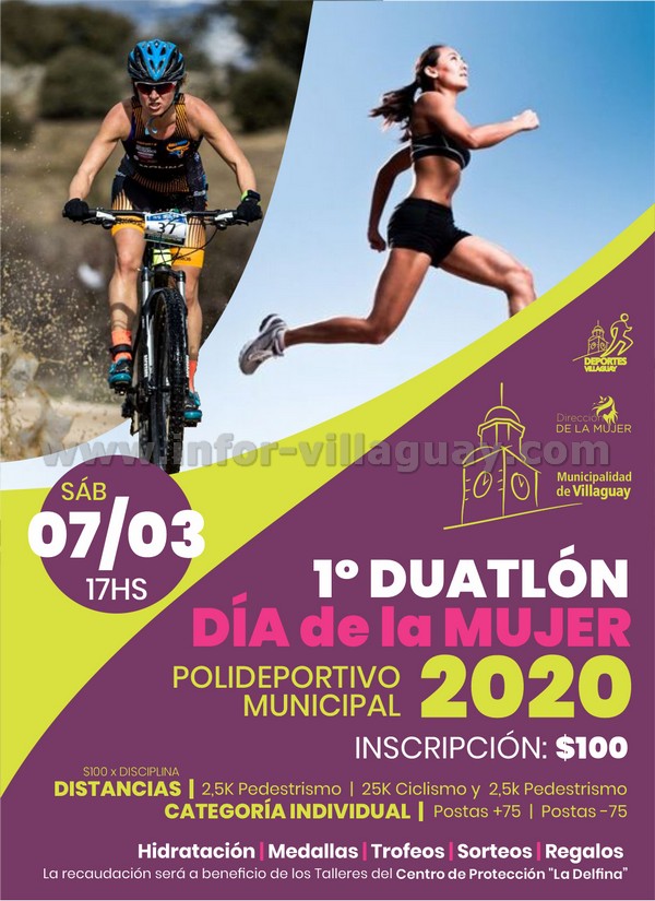 Este sábado 7 de marzo, desde las 17, se disputará el Primer Duatlón “Día de la Mujer” en el Polideportivo. Se trata de una actividad organizada por las Áreas Municipales de la Mujer y Deportes, en el marco de acciones que se realizan en nuestra ciudad por el Día Internacional de la Mujer.