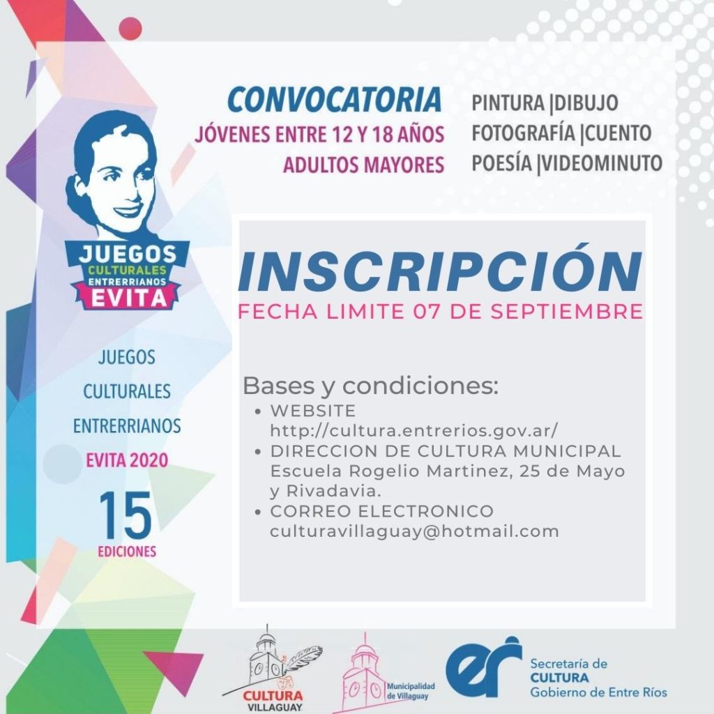 Desde la Dirección de Formación y Diversidad Cultural de la Secretaría de Cultura de Entre Ríos, se ponen en marcha los “Juegos Culturales Entrerrianos Evita 2020” como cada año, comprometiéndose acompañar a cada uno de los municipios en este momento difícil que se atraviesa como sociedad.