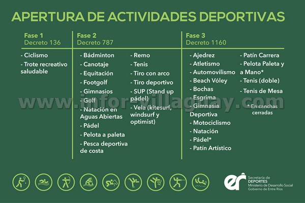 Y para la tercera fase (Decreto 116) las disciplinas que se habilitaron fueron Pádel (canchas cerradas), Tenis (doble), Pelota Paleta y a Mano (Canchas cerradas), Patín Carrera, Patín Artístico, Tenis de Mesa, Esgrima, Bochas, Atletismo, Ajedrez, Gimnasia Deportiva, Motociclismo, Automovilismo, Beach Vóley y Nación.-