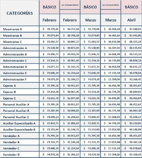 Vendedor D: $92.368,44Así quedaría conformada la escala salarial para empleados de comercio con los aumentos pactados en paritarias para 2021 ya aplicados: