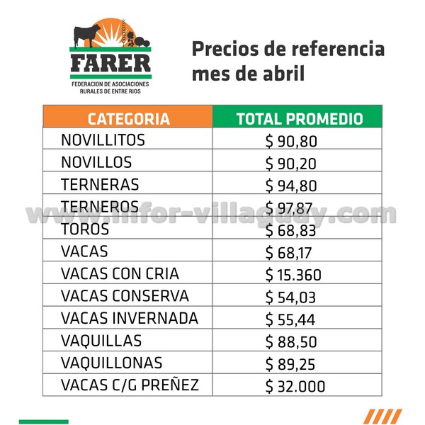 FARER DIO A CONOCER LOS PRECIOS DE REFERENCIA DE HACIENDA VACUNA  DEL MES DE ABRIL EN ENTRE RÍOS