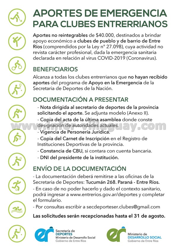 El programa Aportes de Emergencia para clubes entrerrianos es una herramienta de apoyo otorgada por la Secretaría de Deportes del Ministerio de Desarrollo Social para que las instituciones deportivas barriales puedan disponer de una ayuda económica que permita destinarla a aquellas erogaciones que hayan debido afrontar durante el aislamiento social, preventivo y obligatorio por la pandemia del Covid-19.