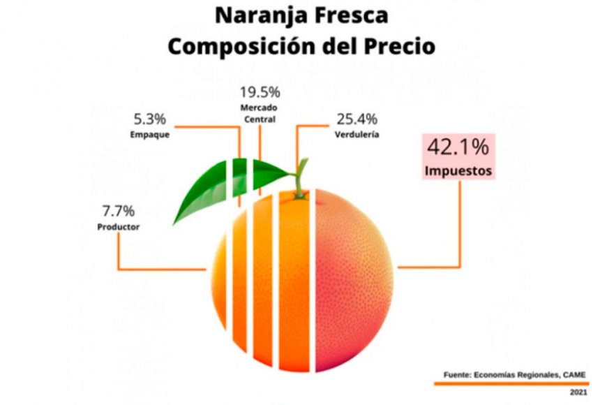 Tras analizar los costos, impuestos y ganancias netas de cada eslabón, el precio de venta final de un kilo de naranja ($69.8), el productor explica el 7.7% ($5.4); el empacador el 5.3% ($3.7); el operador mayorista el 19.5% ($13.6); y el minorista el 25.4% ($17.7). Por su parte, la presión tributaria del Estado, en sus tres niveles, asciende a 42.1% ($29.4), cuando en el año 2020 había sido de 38.3% –para los modelos de simulación analizados–.