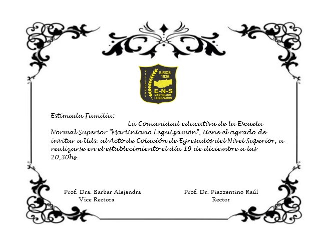 La Rectoría de la Escuela Normal Superior Martiniano Leguizamón invita a docentes y familiares de los Egresados 2019, al acto de colación que se realizará el día jueves 19 de diciembre a las 20.30 h. en el establecimiento, sito en calle Rocamora Nº 72.