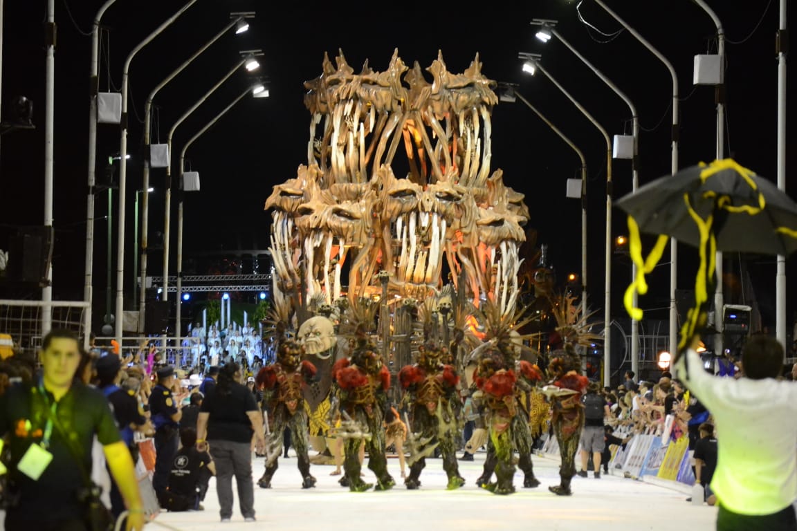 Ará Yeví, la bicampeona de las ediciones 2018 y 2017, fue la encargada de continuar con el arengue y la magia de una noche soñada. Dirigida por Leo Rosviar, presentan su extraordinaria temática “Bestias”. Como una antesala grotesca de la existencia humana, las bestias danzaban al compás de sus entrañas, ignorando tiempos y razones. Carentes de conciencia, desataban sin tapujos sus pasiones, gozando en carne viva, sin ley, sin orden y sin culpa. Pero pronto comenzaron a zanjar diferencias, y algunas bestias desplegaron su dominio sobre el resto. Las bestias más fuertes se adueñaron de las cosas y sometieron al resto a sus designios. Comienza entonces una historia, que se perfecciona sin piedad a lo largo del tiempo: la historia de la dominación. Bestias convertidas en instrumentos, al servicio de otras bestias. Cadenas de las que poco a poco se enamoraron y que el tiempo tornó invisibles. Creyeron creer en dioses, creyeron estar protegidas por reyes, creyeron que eran brujas, que eran locas, que debían estar presas, creyeron necesitar lo que otros ofrecían. Bestias infernales que se tornaron obedientes. Bestias vigiladas, ansiosas por acercarse a la virtud que alguien impone. Pero algunas, disconformes con su suerte, por haber caído en el lado incorrecto del tablero, se levantaron en armas contra sus temibles opresores, más cuando ganaron la batalla, se dedicaron a dominar impunemente. Allí va el ser humano, atrapado en este perverso juego de controles, ubicando sin cesar en los otros sus desgracias. Animándonos a reflexionar si ¿no está la humanidad acaso a mitad de camino entre las bestias y los dioses? ¿Cómo se liberan de esta ciénaga perpetua y levantan vuelo estas almas prisioneras?. Por medio de la música y letras de Gustavo “Titi” Pauletti y Belén Grecco junto a Alma Carnavalera, las tribunas flamean sus apasionados banderines negros y amarillos, colores que identifican el Club Tiro Federal trayendo la alegría con el baile y desplazamiento de la reina Yésica Rodriguez. La puesta en escena por Lino López y las coreografías a cargo de Fernanda Marchesini y Natalia Miño Raffo recrean un mundo de bestias que acechan el carnaval y se liberan con el cierre de batucada y percusión a cargo de Leo Stefani y la pasista Marisol Sanchez.