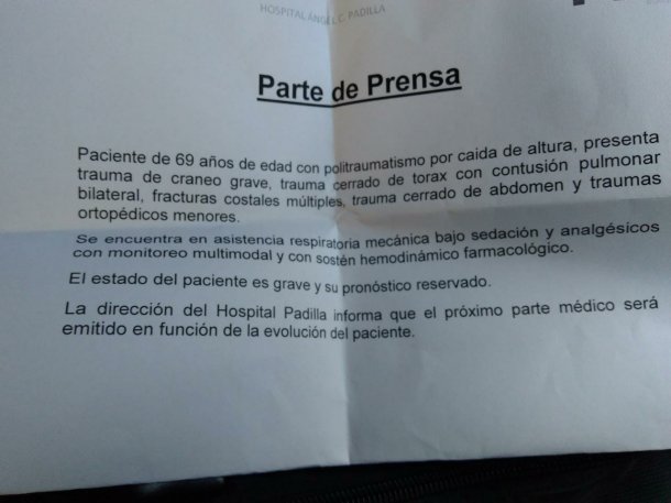 “El estado del paciente es grave y su pronóstico es reservado”, informaron en el parte de prensa que dieron a conocer desde el hospital.
