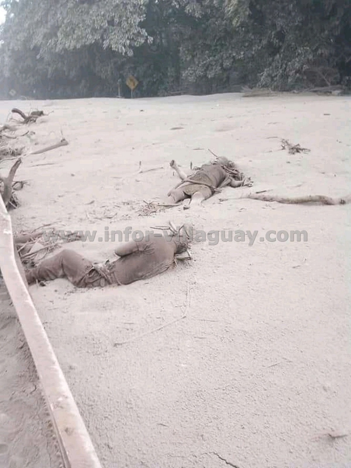 En imágenes difundidas en la televisión y en redes sociales, se ven levantarse enormes columnas de ceniza y en el suelo algunos cadáveres semicubiertos del material expulsado por el volcán, y viviendas y vehículos destruidos.