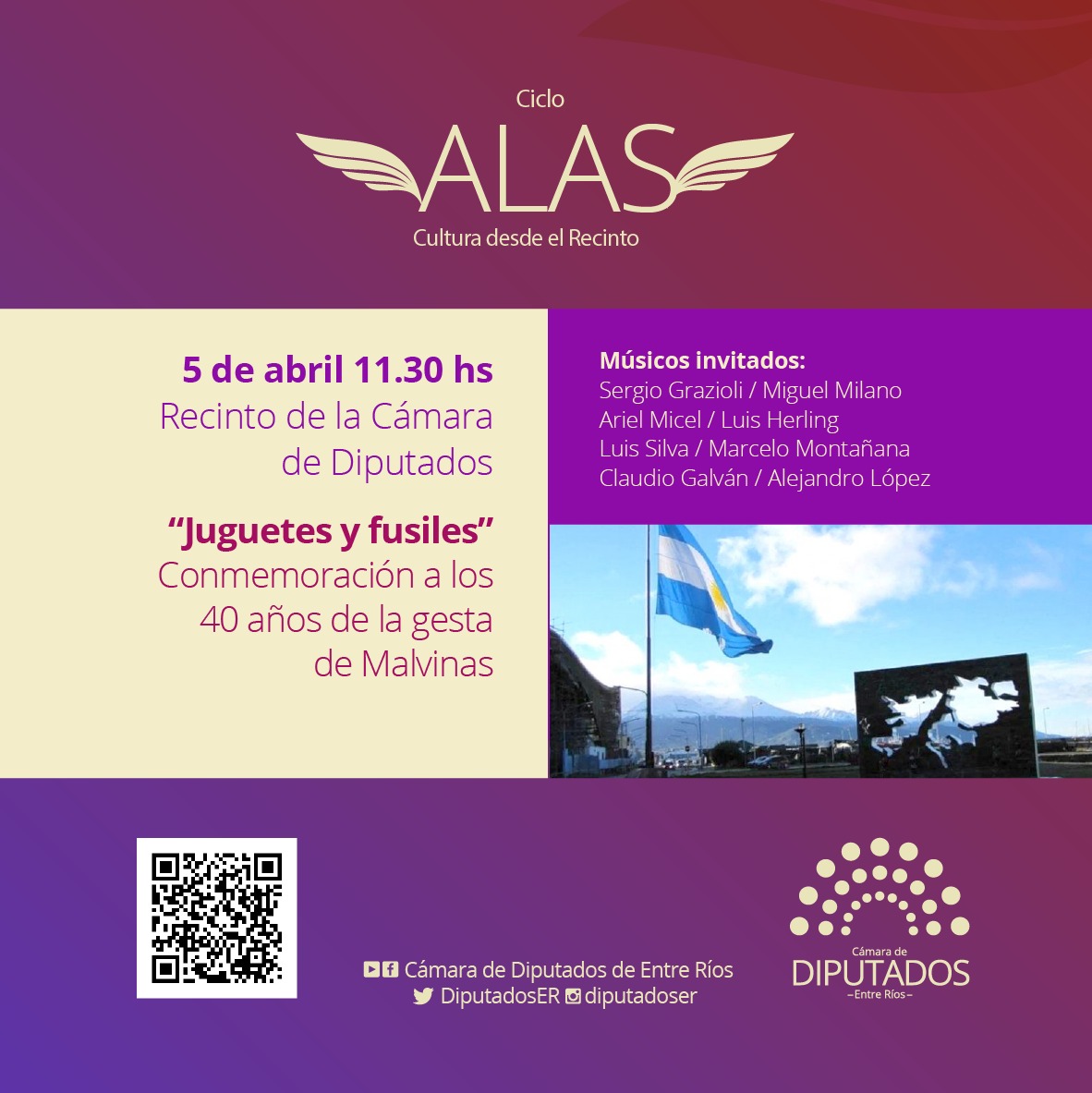 En el marco del Ciclo Cultural Alas impulsado por la Cámara de Diputados de Entre Ríos, este martes a las 11:30 hs. se presentará en vivo la propuesta musical uruguayense Juguetes y Fusiles, que conmemora el 40º aniversario de la Gesta de Malvinas.