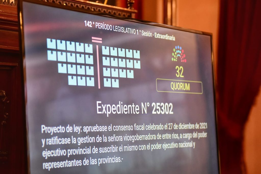 En la primera Sesión Extraordinaria del 142º Período Legislativo, diputadas y diputados dieron media sanción al proyecto de ley por el que se aprueba el Consenso Fiscal celebrado el 27 de diciembre de 2021 y se ratifica la gestión de la vicegobernadora Laura Stratta, a cargo del Poder Ejecutivo Provincial, de suscribir el mismo con el Poder Ejecutivo Nacional y representantes de las provincias.