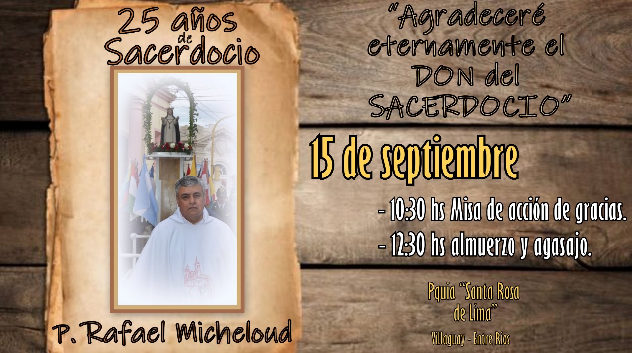 Como integrantes de la Comunidad, invitamos a todos los fieles de la ciudad, barrios, y zona rurales a acompañar al P. Rafael, este Domingo 15 para celebrar junto a él el Gran Regalo del Señor y compartir la Alegria que esto nos produce.