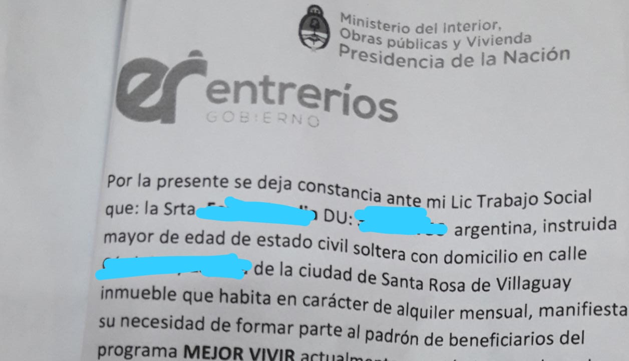 En uno de los casos, el falso gestor “deja constancia” que su víctima “manifiesta la necesidad de formar parte del padrón de beneficiarios del programa Mejor Vivir”, que “no posee bienes muebles ni moto vehículos a su nombre según registro de contribuyentes de ATER, declarando sus ingresos que provienen de trabajos informales”.