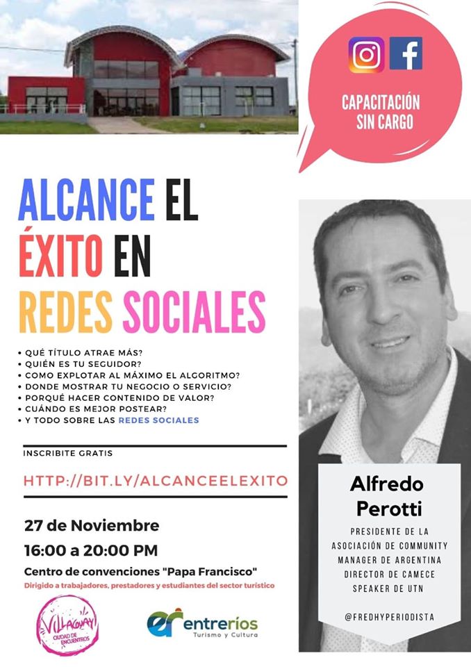 “Alcance el Éxito en Redes Sociales” estará a cargo de Alfredo Perotti, Presidente de la Asociación de Community Manager de Argentina y Director de Camece Speaker de UTN, y se llevara a cabo el próximo miércoles 27 de noviembre de 16 a 20 horas en el Centro de Convenciones Papa Francisco