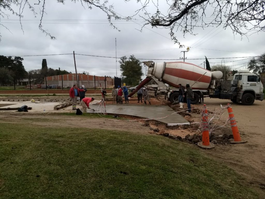 Esta mañana el personal de Obras Públicas de la Municipalidad continuó con los trabajos, que se concentraron en el hormigonado de la esquina de Savio y Belgrano.