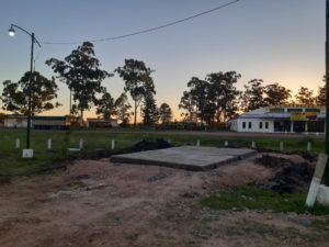 Luego de la finalización de las tareas previas que comprendieron limpieza, nivelación y compactación del suelo, los trabajos se encuentran en una etapa muy avanzada donde ya se culmino con el hormigonado de la base principal.