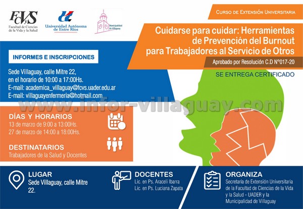 La inscripción debe realizarse en sede de UADER , Mitre 22 de 10 a 17 hs. La propuesta estará destinada a trabajadores de la salud, docentes y público en general.