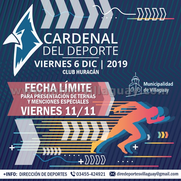 Dirección de Deportes de la Municipalidad de Villaguay comunica a todos los clubes, instituciones deportivas y otras entidades ligadas al deporte de nuestra ciudad y departamento, que hasta el día 11 de Noviembre tienen tiempo para presentar las ternas y menciones especiales de quienes serán los premiados durante la entrega del Cardenal del Deporte 2019.