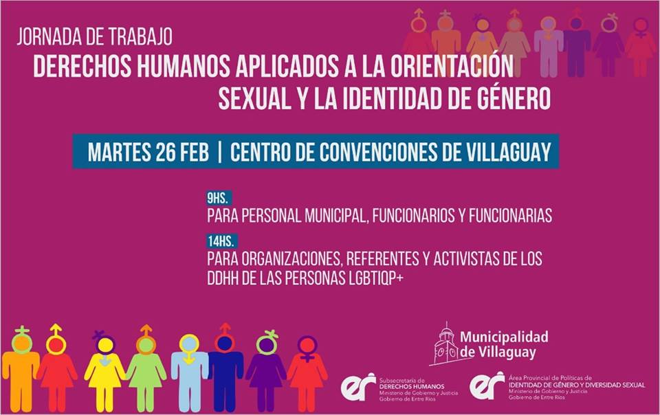 Se realizará una Jornada sobre Derechos Humanos aplicados a la orientación sexual y la identidad de género, mañana martes 26 de febrero en el Centro de Convenciones organizado por la Municipalidad de Villaguay, la Subsecretaría de Derechos Humanos y el Área Provincial de Políticas de Identidad de Género y Diversidad Sexual del Ministerio de Gobierno y Justicia.