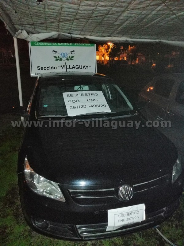 El personal de la Sección Villaguay de Gendarmería Nacional que realizaba patrullaje en zona de ejido procedió a identificar un vehículo ocupado por dos personas que circulaba por la vía pública. Los ocupantes no pudieron justificar la presencia en el lugar, ni exhibieron autorización conforme excepciones previstas por el DNU del gobierno nacional. Por este motivo la fuerza de seguridad formalizo contacto con la fiscalía federal de Concepción del Uruguay, desde donde se instruyó la detención domiciliaria de los involucrados, secuestro del vehículo y el labrado de actuaciones para el inicio de una causa por el incumplimiento de esta disposición nacional.
