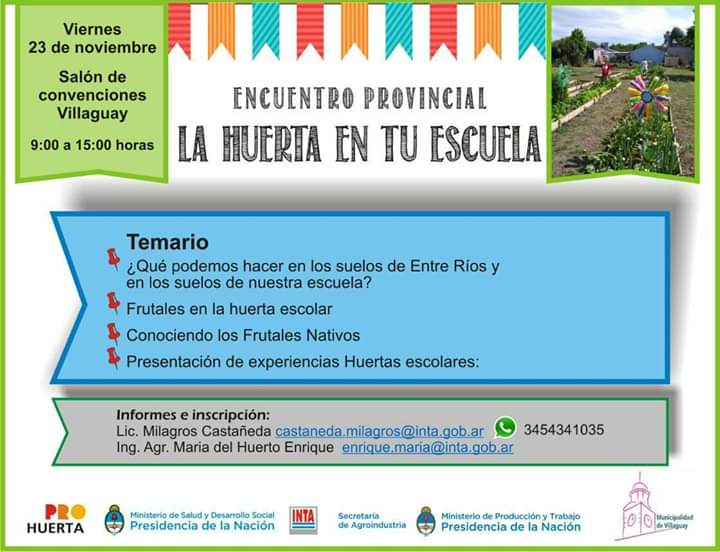 En el encuentro está previsto el tratamiento de estos temas. ¿Qué podemos hacer en los suelos de Entre Ríos y en los suelos de nuestra escuela? – Frutales en la huerta escolar – Conociendo los frutales nativos – Presentación de experiencias de huertas escolares.