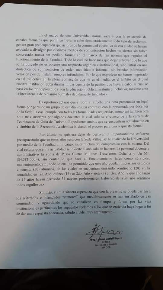 Entendemos el reclamo de otros temas pendientes, pero no podemos entender y no sabemos el fin perseguido por algunas personas relacionadas con la Sede al seguir engañando a la comunidad de Villaguay, desprestigiando una Sede Universitaria local en los medios provinciales y sobre todo generando angustia en los alumnos por un hecho falso y descartado en forma clara y contundente por las autoridades de la Facultad.