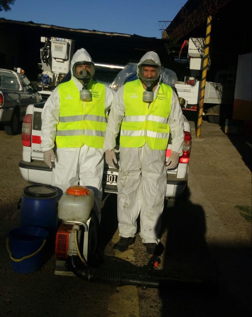 La desinfección está a cargo de la «Patrulla de Higiene y Desinfección», con personal de Bromatología del municipio y durante los operativos agentes de Tránsito asiste en los mismos, a fin de evitar el contacto con las aplicaciones durante la realización de estas.