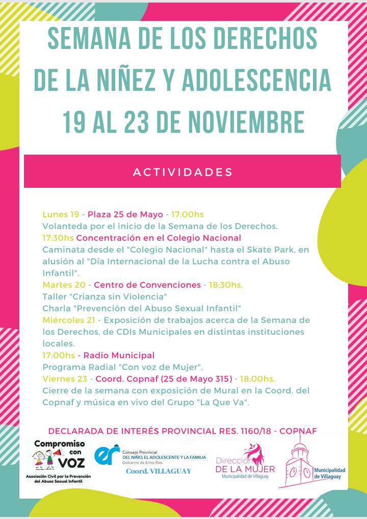 Las propuestas son impulsadas conjuntamente por la Dirección de la Mujer de la municipalidad de Villaguay, el Consejo Provincial del Niño, el Adolescente y la Familia (COPNAF) y el grupo “Compromiso con voz” y se iniciarán el lunes a las 17 en la plaza 25 de Mayo, con una volanteada por el inicio de la Semana de los Derechos.