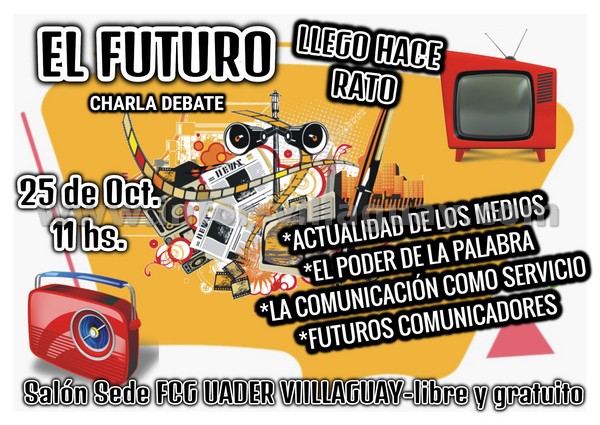 El día viernes desde las 11 hs. tendrá lugar en el salón de la sede de la UADER en Mitre y Herrera de nuestra ciudad, la charla abierta y debate “El futuro llego hace rato”, Como ocurrió el año pasado, llega su segunda edición,  una jornada dirigida a profesionales de los medios de comunicación, estudiantes y público en general interesado en la temática comunicacional. La idea y objetivo de la misma es generar un espacio donde diferentes puntos de vista  sean expuestos, abrir el debate sobre los mismos, para entender la importancia de los medios  de comunicación en diferentes aspectos y ámbitos. Los ejes principales de este año son, la actualidad de los medios de comunicación, tanto a nivel nacional como local, el poder de la palabra, la comunicación como servicio y los futuros comunicadores. La charla estará a cargo de Salvador Rodriguez, Operador Técnico Nacional, Docente de Eter Paraná, acompañado de una mesa de grandes profesionales, comunicadores afines a los medios de comunicación. Esta jornada se realiza como cierre del taller de radio brindado por Silvana Soto y Germán Treppo durante estos últimos meses, que también contara con la entrega de certificados a los participantes del mismo. Ademas se realizara un homenaje al Periodista y amigo Martín Carruego, quien el año anterior participo del panel exponiendo sobre las Fakes News