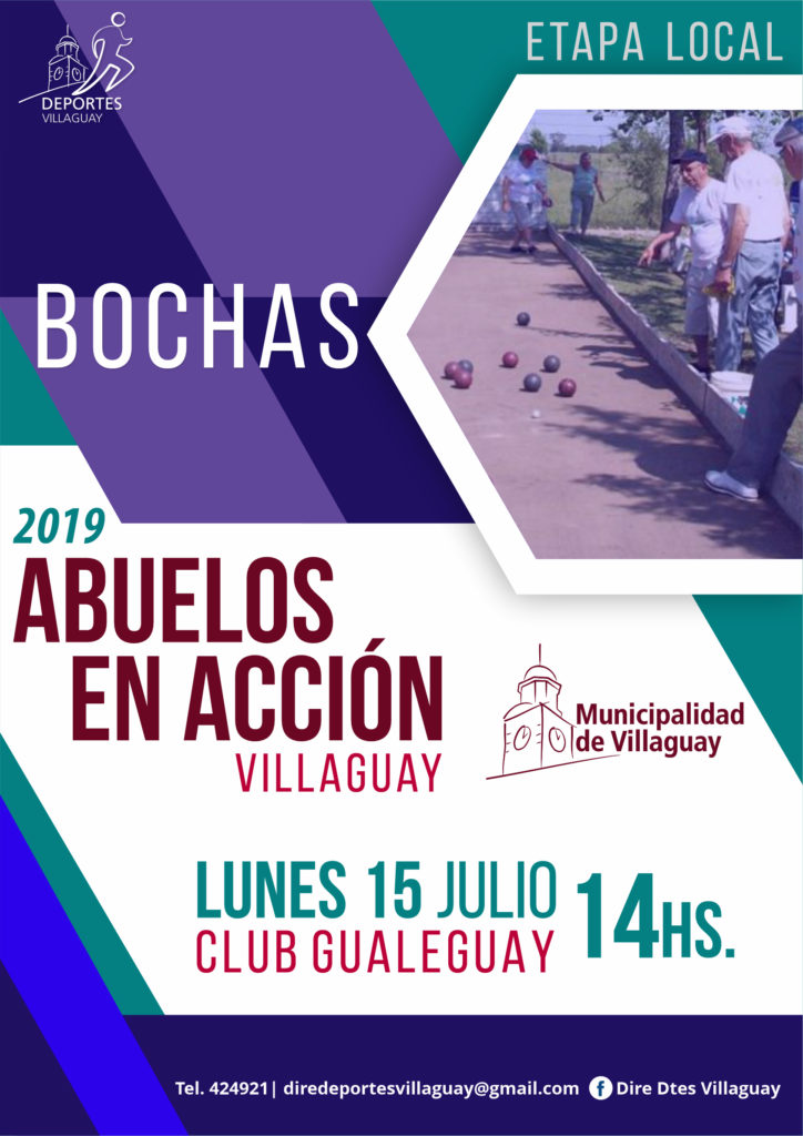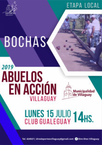 Dirección de Deportes de la Municipalidad de Villaguay informa que hoy lunes 15 de Julio se llevara a cabo la etapa local de los Juegos Deportivos Abuelos en Acción en la disciplina Bochas.
