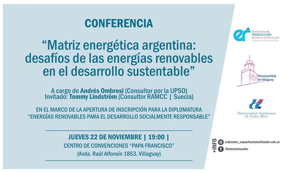 La actividad tendrá lugar en el Centro de Convenciones “Papa Francisco” de Villaguay (Avda. Raúl Alfonsín 1853) el jueves 22 de noviembre, a las 19:00. Estará a cargo de Andrés Omar Ombrosi, integrante de la Plataforma de Tecnología de Energías Renovables del Sudoeste de la Provincia de Buenos Aires y consultor por la Universidad Provincial del Sudoeste de la Provincia de Buenos Aires (UPSO).