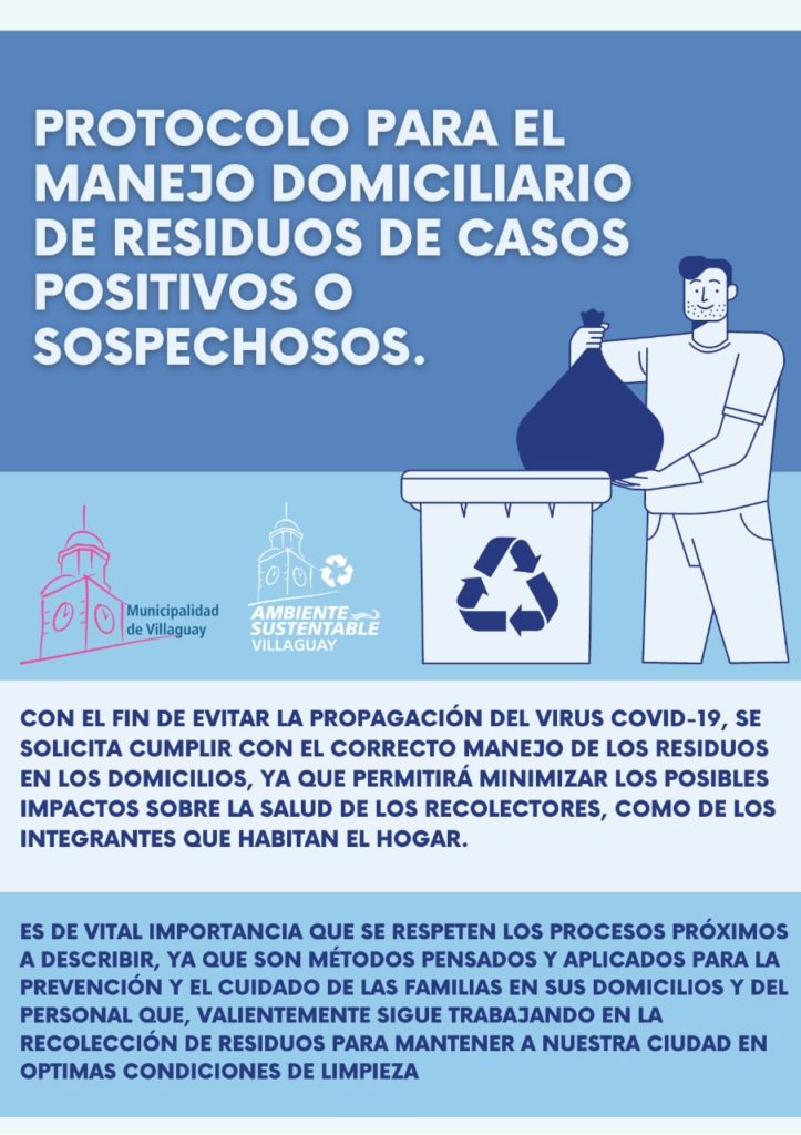 La Municipalidad de Villaguay, a través de la Dirección de Ambiente Sustentable con el fin de evitar la propagación del virus Covid-19 solicita cumplir con el correcto manejo de los residuos en los domicilios, ya que permitirá minimizar los posibles impactos sobre la salud de los recolectores como de los integrantes que habitan el hogar.