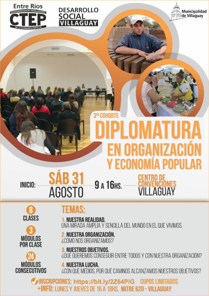 El próximo sábado 31 de Agosto, desde las 9 a 16 hs, en el Centro de Convenciones de Villaguay iniciará el dictado de una Diplomatura en Organización Comunitaria y Economía Popular.