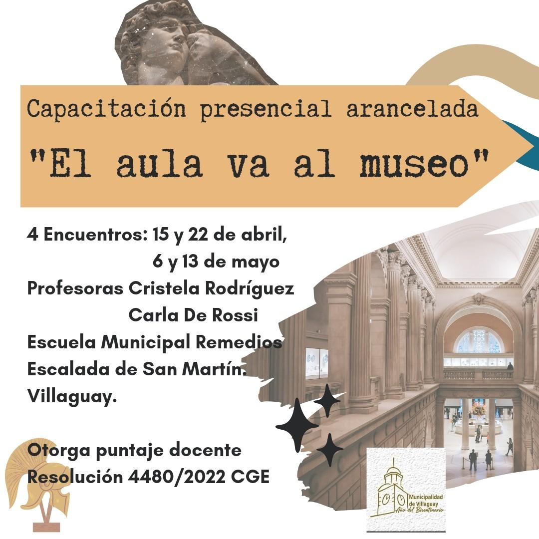 La Municipalidad de Villaguay, a través de la Dirección de Educación, invita a participar de la capacitación docente denominada “El Aula va al Museo”, iniciativa enmarcada en el Año del Bicentenario de esta ciudad, que se desarrollará en la escuela municipal “Remedios Escalada de San Martín”.