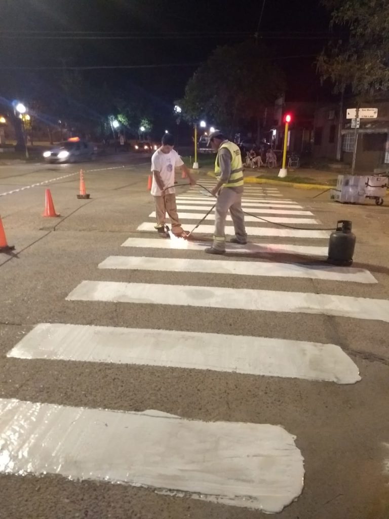 Las tares se localizaron durante esta semana en la intersección de Avenida San Martin y Boulevard Savio, donde se procede a colocar  pintura termoplástica en caliente, material indicado para este tipo de tareas.
