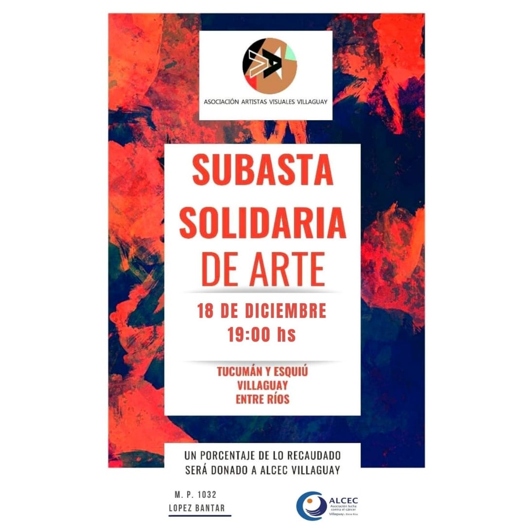En colaboración con ALCEC, la Asociación de Artistas Visuales de Villaguay y el Martillero Público Yamil López Bantar, Mat. N° 1032, estarán realizando una Subasta Solidaria de Arte el próximo sábado 18 de diciembre a las 19 hs. en el salón de ALCEC, ubicado en calle Tucumán y Esquiú de nuestra ciudad.