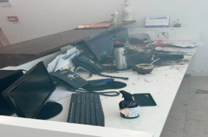 La escena fue retratada en una foto que muestra un polvo negro desparramado, principalmente, sobre el monitor y el teclado de una computadora, el mouse, un teléfono, algunos papeles, un termo y un mate. Aún no pudieron determinar si se trataba de pólvora o de alguna sustancia no identificada.