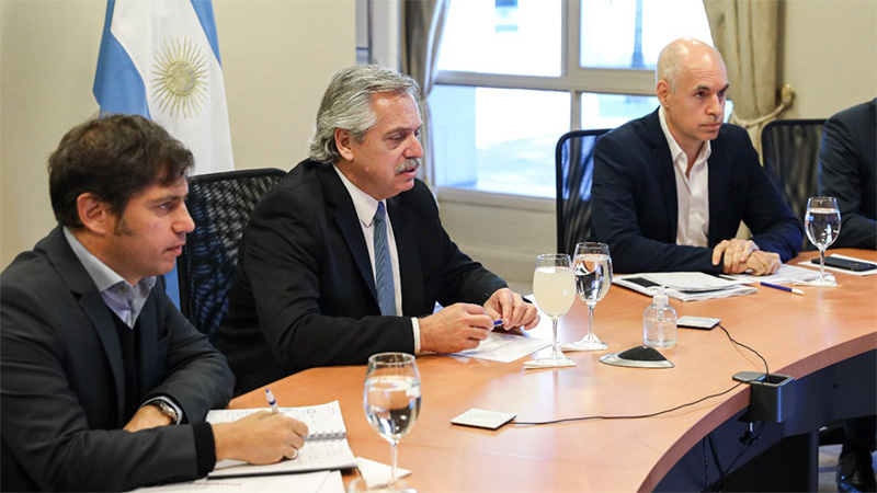 El Presidente estuvo acompañado en forma presencial por Rodríguez Larreta y el gobernador bonaerense, Axel Kicillof, además de los ministros del Interior, Eduardo «Wado» De Pedro, y de Salud, Ginés González García, entre otros funcionarios.