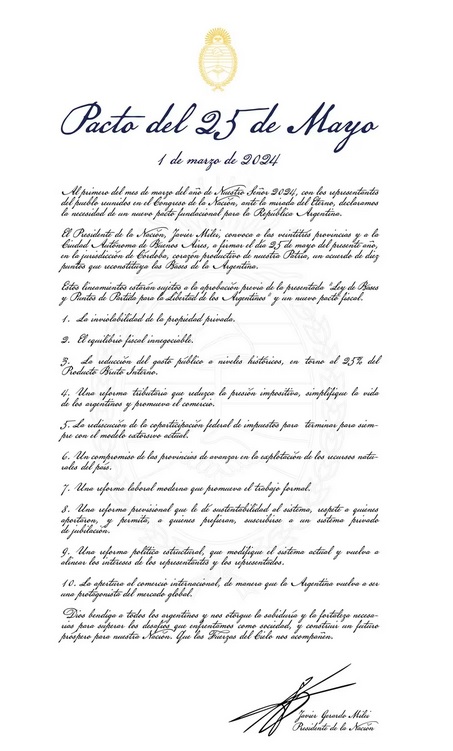 El Presidente de la Nación, Javier Milei, convoca a las veintitrés provincias y a la Ciudad Autónoma de Buenos Aires, a firmar el día 25 de mayo del presente año, en la jurisdicción de Córdoba, corazón productivo de nuestra Patria, un acuerdo de diez puntos que reconstituye las Bases de la Argentina.