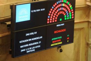 El DNU fue rechazado al obtener tan sólo 11 votos a favor de su ratificación. En contra, es decir por su derogación, votó un mosaico de 49 senadores integrado en su mayoría por el kirchnerismo, la UCR y tres miembros de Pro.