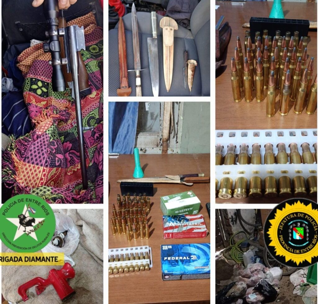 Para la ejecución del procedimiento se coordinaron las tareas entre las Brigadas de Nogoyá y Diamante contando con la colaboración de la Dependencia local, obteniéndose resultados satisfactorios con el secuestro de un Arma de Fuego tipo Fusil calibre .308 con mira telescópica adosada, más de 35 cartuchos calibre .308 y vainas servidas mismo calibre, sierra de carnicero de mano, balancín de carga con dos ganchos para desposte, distintos tipos de cuchillos y chairas, máquina de picar carne, cómo así también se hallaron cortes cárnicos, alrededor de 20 kg, procedentes en su mayoria de animales silvestres, por lo que ademas se debieron confeccionar las correspondientes diligencias por infracción a la Ley provincial de Caza.
