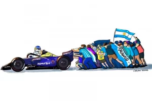 Percara se destaca por plasmar en sus dibujos a artistas y personalidades nacionales e internacionales. Hoy, con el dibujo del monoplaza empujado por un grupo de personas, a su arte le sumó la pasión, esa que tanto identifica a los argentinos.