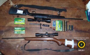 Siguiendo lo establecido en el Mandamiento Judicial, los efectivos policiales tras una exhaustiva búsqueda en el inmueble, obtuvieron resultados satisfactorios procediéndose al formal secuestro de un Arma de Fuego cal. 270, marca SAVAGE, modelo Axis Winchester; un Arma de Fuego tipo carabina cal. .22 mm., marca WINCHESTER MAGNUM, y gran cantidad de cartuchería correspondientes a los calibres mencionados.