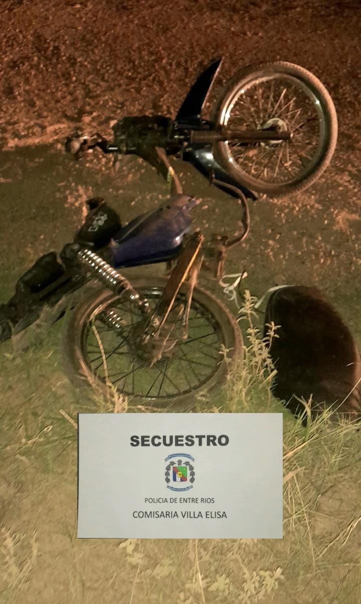 En la víspera, alrededor de las 22.40 horas, se toma conocimiento a través de un llamado telefónico emanado desde Prevención Urbana de Villa Elisa, donde informaba que personal de la misma circulaba por Bvard. Schroeder y prolongación de Avda. Mitre en dirección Este-Oeste, se cruzan con una moto tipo CG., con escape libre que lo hacía en sentido contrario. En este ciclomotor iban dos masculinos, llevando el acompañante sobre sus hombros un ciclomotor que fue arrojado inmediatamente en la vía pública al percatarse de su presencia en la zona, dándose a la fuga hacia Ruta 130. Intervino personal policial de Comisaría de la localidad homónima controlando el rodado en cuestión, constatando que está sin motor, con número de cuadro legible, sin marca visible, además se pudo corroborar que no se encuentra registrado en DNRPA. Informado el Fiscal en Turno, dispuso el formal secuestro de la moto, iniciándose Actuaciones policiales para establecer real procedencia y propiedad.-