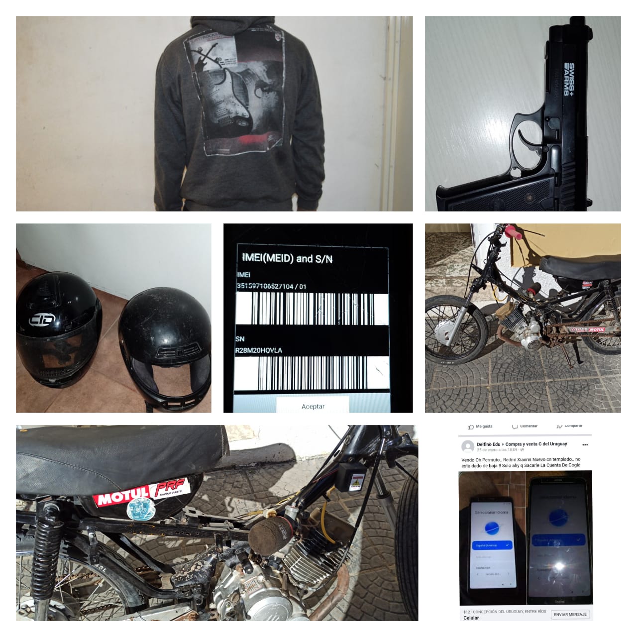 A las 03:15 horas de hoy, se tomó conocimiento en Comisaría San José sobre dos masculinos en actitud sospechosa, que llevaban de tiro una motocicleta por colectora Este de la Autovía José Gervasio Artigas, cerca de la Estación de servicio ubicada a metros del ingreso a Colón por Ruta Internacional Nº 135. Constituido  personal policial en la zona descripta, hallan efectivamente a dos personas de sexo masculino trasladando en forma peatonal una moto. Ambos fueron conducidos a Jefatura Departamental para su correcta identificación, resultando ser dos jóvenes de 19 años, domiciliados en un mismo barrio de C. del Uruguay. Al efectuar el palpado respectivo por parte de los uniformados, uno de ellos portaba un arma tipo pistola, réplica de 9 mm., de aire comprimido. En cuanto a la moto carecía de documentación, por lo que fue formalmente secuestrada para establecer real procedencia y propiedad. Personal de División Investigaciones realizó tareas investigativas que resultaron muy satisfactorias, ya que estos dos individuos por su fisonomía y vestimenta estarían relacionados con un Robo Calificado perpetrado el 24 de Enero próximo pasado en el ingreso a San José desde Autovía “José G. Artigas” por Estrada. Informado el Fiscal en Turno, dispuso la detención de estas dos personas como supuestos autores del delito de mención, y que queden alojados detenidos en Jefatura a disposición de la Justicia interviniente. Se secuestraron además, el arma hallada, ropas y demás efectos que tendrían relación directa con la causa.-