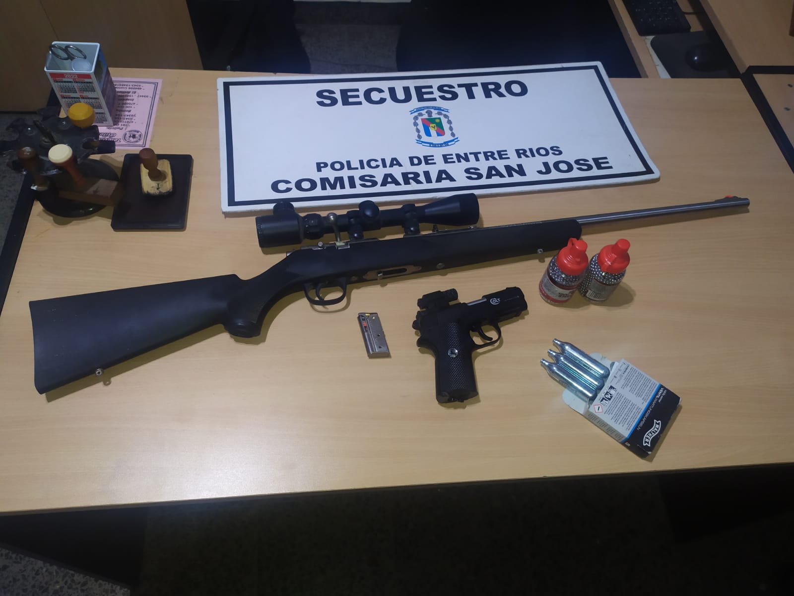 En horas de la noche de la fecha, en relación a una causa por violencia familiar, personal Policial realizó un allanamiento y requisa domiciliaria en una finca, ubicada sobre calle Dr Bastian de la Ciudad de San José, lugar hablado por un masculino mayor de edad, donde procedió al formal secuestro de un arma de fuego tipo carabina calibre 22, con mira telescópica, un arma réplica de polímero, con mira y con cargador de gas, como así también otros elementos de interés en la causa.