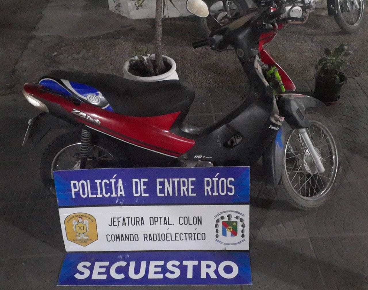 En horas de la tarde, personal de la División Investigaciones contando con información precisa concurrió a un domicilio ubicado en zona Oeste del Barrio El Brillante donde se pudo se pudo secuestrar una motocicleta Marca Motomel modelo 110cc , la que se encontraba en posesión de un joven de poca edad, posterior a esto se dio conocimiento a la Fiscalía en Turno lo que ordenó el secuestro de la misma y se pudo establecer que dicha motocicleta había sido sustraída el día martes próximo pasado de esta ciudad de Colón, siendo entregada a su real propietario, fue identificada una persona mayor de edad, progenitor del joven involucrado.
